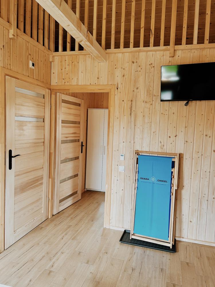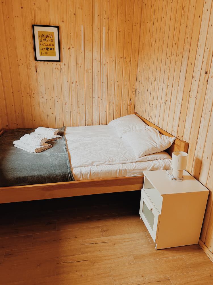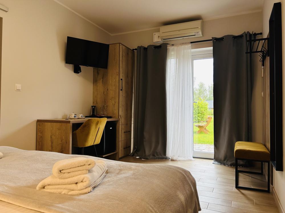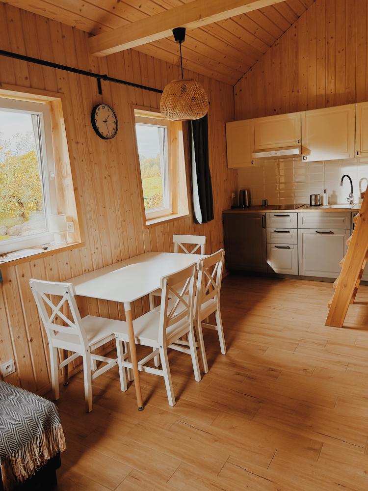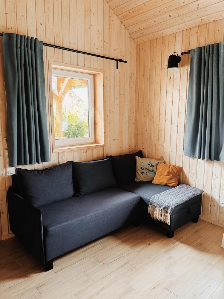 W pokoju dziennym znajduje się wygodna, rozkładana sofa, na której mogą spać dodatkowe 2 osoby, duży stół, cztery krzesła oraz wieszak na ubrania. W części kuchennej dostępne jest standardowe wyposażenie takie jak lodówka, płyta indukcyjna, czajnik elektryczny i kompletne akcesoria kuchenne. Wygodny, zadaszony taras z przodu domku pozwoli Gościom na dobry odpoczynek i kontakt z pięknem natury. Tarasy wyposażone są w zestawy wypoczynkowe. Domek posiada sieć Wi-Fi, klimatyzację z funkcją grzania i ogrzewanie podłogowe.